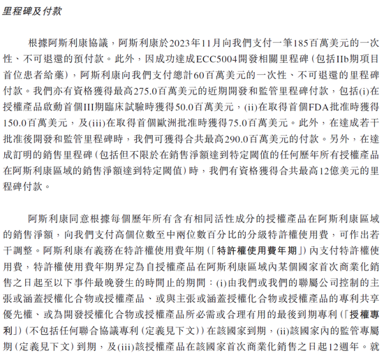 诚益生物小分子GLP-1受体激动剂与阿斯利康达成合作开发协议,阿斯利康支付1.85亿美元预付款,另已经收到2b期首例给药的6000万美元里程碑付款,近期里程碑还有首个三期临床启动的5000万美元里程碑,FDA批准的1.5亿美元里程碑,欧洲首个批准的7500万美元里程碑,后续开发和监管里程碑还有2.9亿美元里程碑付款。商业里程碑最高12亿美元,销售分成比例为高个位数至中两位数百分比。